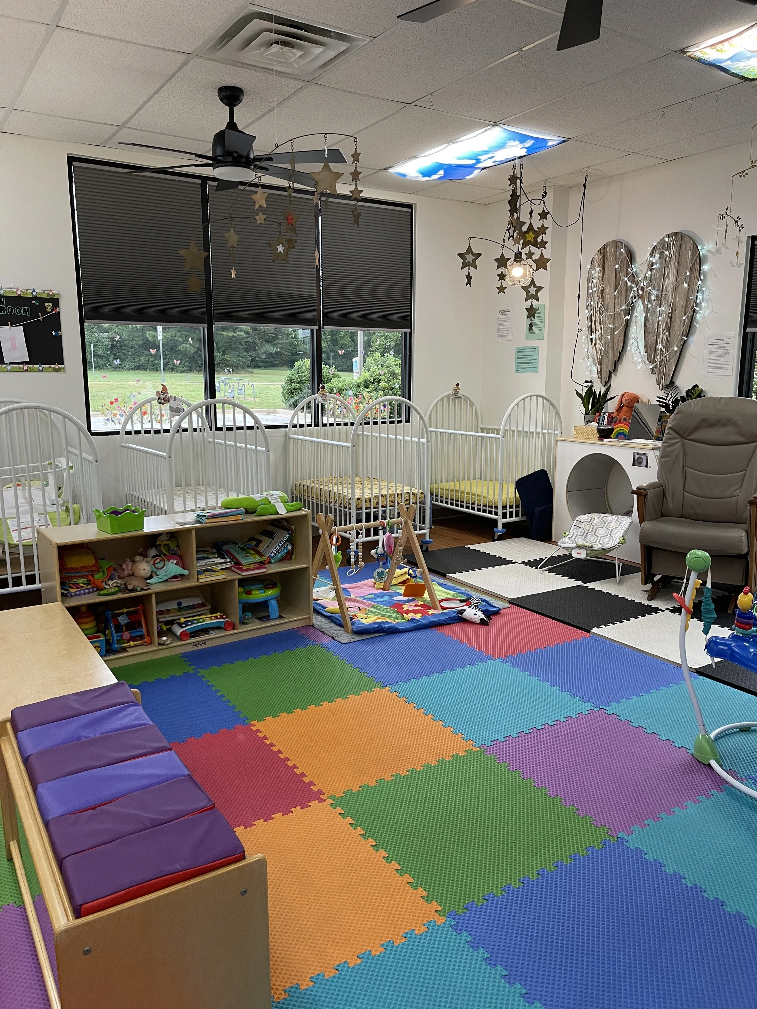 Scroll through our different classrooms — each for a specific age group — and look at a sample schedule. Each classroom has areas for dramatic play, music play, and science and math learning. There are reading areas and cozy areas in each room, too. Children have their own spaces to nap and enjoy their three meals / day. If you have any questions about the room your child(ren) will be spending their day, don’t hesitate to reach out or come by for a tour.